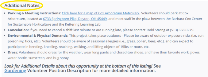 In the "Additional Notes" section of the opportunity, you'll find important info like: - Where to meet staff - How to contact them if needed - What to expect (physical and environmental demands) - What to wear and bring